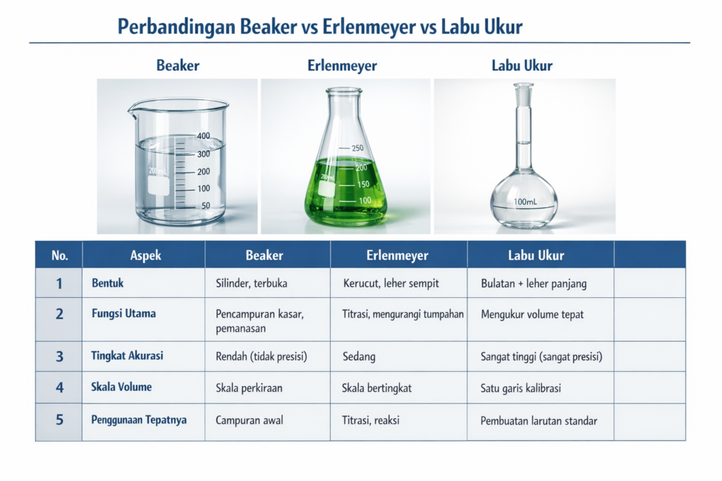 Tabel Perbandingan Beaker vs Erlenmeyer vs Labu Ukur